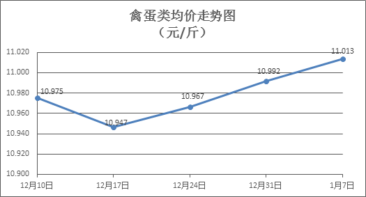 禽蛋類商品價格窄幅盤升。上周所監(jiān)測的6種禽蛋類商品價格波動情況為3漲2跌1平,綜合零售均價為11.013元/斤,環(huán)比上漲0.20%。其中:白條雞、白條鴨零售均價分別為每斤20.14元、15.32元,環(huán)比分別上漲1.46%、下降0.78%;白殼雞蛋、鴨蛋零售均價分別為每斤6.77元、7.83元,環(huán)比分別持平、下降1.88%。
