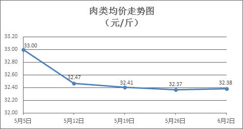 肉類商品價格微幅盤整。所監測的8種肉類商品價格波動情況為4漲4跌,綜合零售均價為每斤32.38元,環比上漲0.04%。其中:排骨、精瘦肉、牛肉、帶骨羊肉零售均價分別為每斤29.67元、18.43元、48.38元、42.57元,環比分別上漲0.85%、上漲0.49%、下降0.06%、下降0.61%。
