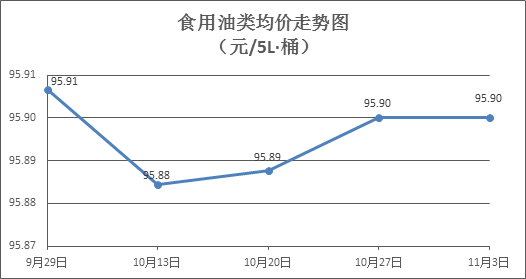 食用油類商品價格平穩。所監測的9種食用油(5L裝)商品價格均持平,綜合零售均價為每桶95.90元,環比持平。其中:金龍魚花生油、金龍魚調和油零售均價為每桶102.81元、71.29元,環比均持平。