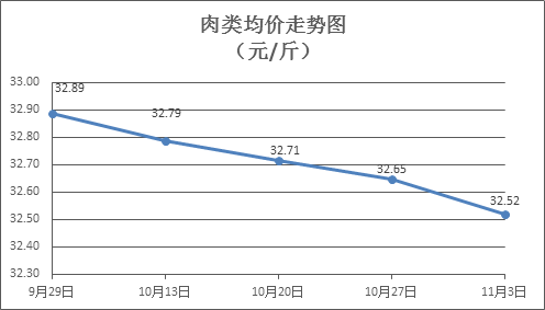 肉類商品價格持續回調。所監測的8種肉類商品價格波動情況為3漲5跌,綜合零售均價為每斤32.52元,環比下降0.39%。其中:排骨、精瘦肉、腱子肉、牛腩零售均價分別為每斤32.29元、20.17元、48.80元、38.81元,環比分別上漲0.04%、下降0.27%、下降0.80%、下降1.48%。
