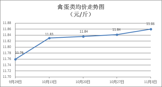 禽蛋類商品價格微幅盤整。所監測的5種禽蛋類商品價格波動情況為2漲3跌,綜合零售均價為每斤11.86元,環比上漲0.14%。其中:白條雞、白條鴨零售均價分別為每斤20.44元、15.36元,環比分別上漲0.41%、下降0.02%;雞蛋、鴨蛋零售均價分別為每斤6.55元、7.76元,環比分別上漲0.46%、下降0.37%。