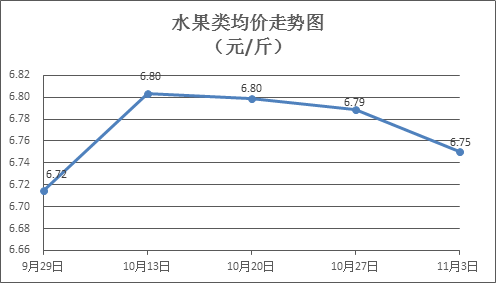 水果類商品價格有所下降。所監測的6種水果商品價格波動情況為2漲4跌,綜合零售均價為每斤6.75元,環比下降0.60%。其中橙子、蘋果、葡萄零售均價分別為每斤6.67元、7.42元、13.49元,環比分別下降0.55%、下降0.35%、上漲1.32%。
