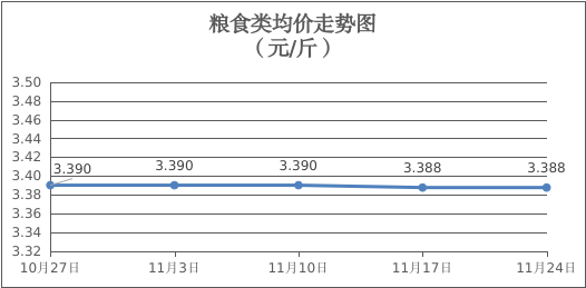 糧食類商品價格保持穩(wěn)定。所監(jiān)測的4種糧食類商品價格均持平,零售均價為每斤3.388元。其中:油粘米、富強粉零售均價分別為每斤3.51元、3.36元,環(huán)比均持平。