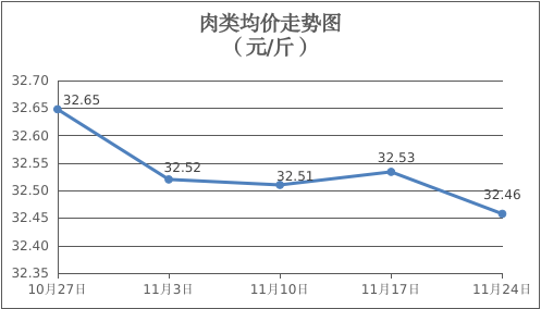 肉類商品價格微幅盤降。所監(jiān)測的8種肉類商品價格波動情況為1漲5跌2平,綜合零售均價為每斤32.46元,環(huán)比下降0.23%。其中:排骨、精瘦肉、牛肉、帶骨羊肉零售均價分別為每斤32.10元、20.05元、45.80元、41.67元,環(huán)比分別下降0.77%、持平、下降0.17%、下降0.36%。