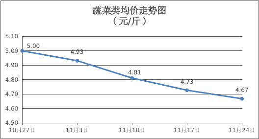 蔬菜類商品價格以降為主。所監(jiān)測的32 種蔬菜商品價格波動情況為8漲24跌,綜合零售均價為每斤4.67元,環(huán)比下降1.25%。其中:漲幅居前的品種包括白莧菜、水空心菜、本地菜心,零售均價分別為每斤4.69元、4.28元、4.66元,環(huán)比分別上漲5.63%、3.38%、1.75%;跌幅靠前的品種包括花菜、菠菜、青尖椒,零售均價分別為每斤4.91元、5.54、5.55元,環(huán)比分別下降7.88%、6.26%、5.77%。