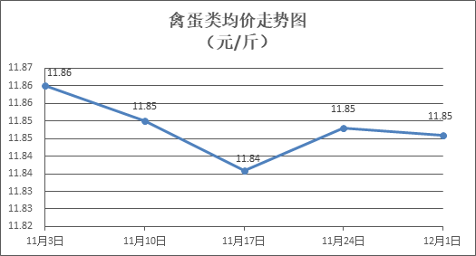 禽蛋類商品價格小幅波動。所監測的5種禽蛋類商品價格波動情況為2漲2跌1平,綜合零售均價為每斤11.85元,環比下降0.02%。其中:白條雞、白條鴨零售均價分別為每斤20.46元、15.33元,環比分別上漲0.34%、下降0.07%;雞蛋、鴨蛋零售均價分別為每斤6.55元、7.71元,環比分別上漲0.15%、下降1.03%。