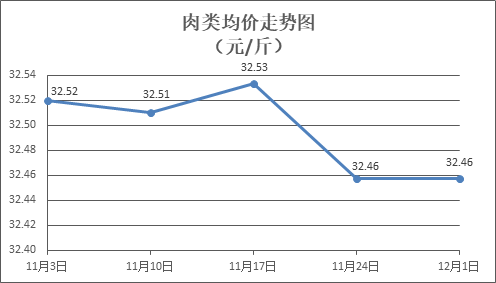 肉類商品價格微幅盤整。所監測的8種肉類商品價格波動情況為3漲4跌1平,綜合零售均價為每斤32.46元,環比持平。其中:排骨、精瘦肉、牛肉、帶骨羊肉零售均價分別為每斤32.16元、20.05元、45.75元、41.62元,環比分別上漲0.19%、持平、下降0.11%、下降0.12%。
