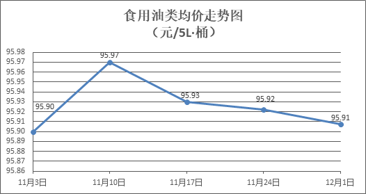 食用油類商品價格基本平穩。所監測的9種食用油(5L裝)商品價格波動情況為1漲1跌7平,綜合零售均價為每桶95.91元,環比下降0.02%。其中:金龍魚花生油、菜籽油零售均價為每桶102.70元、73.67元,環比分別上漲0.03%、下降0.22%。