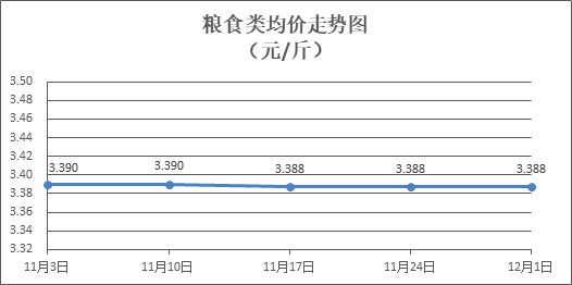 糧食類商品價格保持穩定。所監測的4種糧食類商品價格均持平,零售均價為每斤3.388元。其中:油粘米、富強粉零售均價分別為每斤3.51元、3.36元,環比均持平。