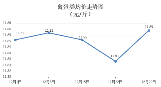 禽蛋類商品價格略有回升。所監測的5種禽蛋類商品價格波動情況為3漲2平,綜合零售均價為每斤11.85元,環比上漲0.22%。其中:白條雞、白條鴨零售均價分別為每斤20.64元、15.25元,環比分別上漲0.44%、上漲0.20%;雞蛋、咸鴨蛋零售均價分別為每斤6.55元、9.15元,環比分別持平、上漲0.11%。