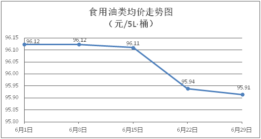 食用油類商品價格穩中微降。所監測的9種食用油(5L裝)商品價格波動情況為2漲4跌3平,綜合零售均價為每桶95.91元,環比下降0.03%。其中:大豆油、玉米油零售均價為每桶61.42元、76.24元,環比分別下降0.13%、上漲0.07%。