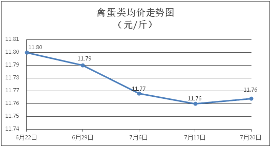 禽蛋類商品價格弱勢盤整。所監測的5種禽蛋類商品價格波動情況為1漲3跌1平,綜合零售均價為每斤11.76元,環比上漲0.03%。其中:白條雞、白條鴨零售均價分別為每斤20.66元、15.39元,環比分別上漲0.39%、下降0.19%;雞蛋、鴨蛋零售均價分別為每斤6.52元、7.11元,環比分別下降0.15%、持平。