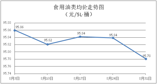 食用油類商品價格穩中微跌。所監測的9種食用油(5L裝)商品價格波動情況為4跌5平,綜合零售均價為每桶95.78元,環比下降0.06%。其中:金龍魚花生油、大豆油零售均價分別為每桶102.38元、61.50元,環比分別下降0.23%、下降0.13%。