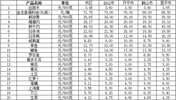 說明:1、表中價格為該地區(qū)監(jiān)測點(diǎn)上周綜合平均價;2、“市區(qū)”含蓬江區(qū)、江海區(qū)、新會區(qū),價格分別采自蓬江市場、江南市場、城東市場等13家農(nóng)貿(mào)市場;3、其他四個縣市價格分別采自新華市場、錦江市場等8家農(nóng)貿(mào)市場。