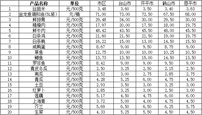 說明:1、表中價格為該地區(qū)監(jiān)測點綜合平均價;2、“市區(qū)”含蓬江區(qū)、江海區(qū)、新會區(qū),價格分別采自蓬江市場、江南市場、城東市場等13家農(nóng)貿(mào)市場;3、其他四個縣市價格分別采自新華市場、錦江市場等8家農(nóng)貿(mào)市場。