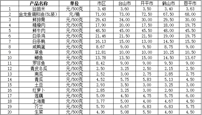 說明:1、表中價格為該地區監測點上周綜合平均價;2、“市區”含蓬江區、江海區、新會區,價格分別采自蓬江市場、江南市場、城東市場等13家農貿市場;3、其他四個縣市價格分別采自新華市場、錦江市場等8家農貿市場。