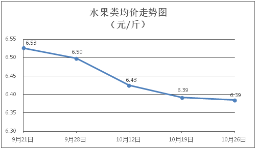 水果類商品價格窄幅盤整。所監測的6種水果商品價格波動情況為2漲2跌2平,綜合零售均價為每斤6.39元,環比下降0.10%。其中橙子、香蕉、西瓜零售均價分別為每斤7.35元、2.83元、3.19元,環比分別下降0.81%、持平、上漲0.63%。