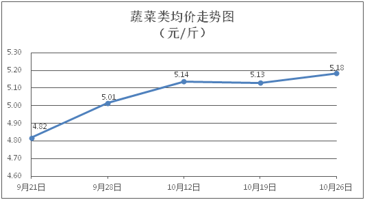 蔬菜類商品價格以漲為主。所監測的32 種蔬菜商品價格波動情況為18漲10跌4平,綜合零售均價為每斤5.18元,環比上漲1.08%。其中:漲幅居前的品種包括白莧菜、黃瓜、西洋菜,零售均價分別為每斤5.08元、4.97元、6.38元,環比分別上漲5.61%、5.30%、4.93%;跌幅靠前的品種為茄子、絲瓜、青豆角,零售均價分別為每斤4.27元、6.29元、5.66元,環比分別下降0.93%、0.79%、0.70%。
