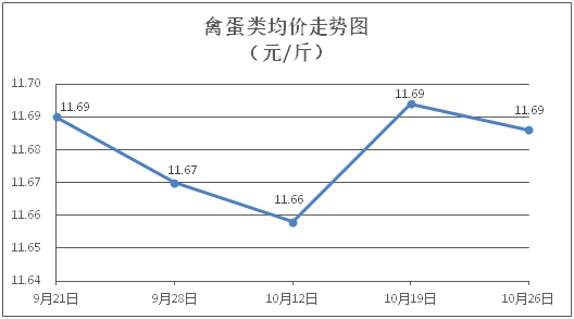 禽蛋類商品價格穩中微降。所監測的5種禽蛋類商品價格波動情況為2跌3平,綜合零售均價為每斤11.69元,環比下降0.07%。其中:白條雞、白條鴨零售均價分別為每斤20.88元、15.20元,環比分別下降0.10%、下降0.13%;雞蛋、鴨蛋零售均價分別為每斤6.39元、7.07元,環比均持平。