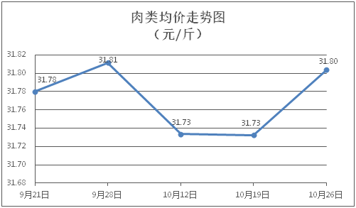 肉類商品價格微幅波動。所監測的8種肉類商品價格波動情況為4漲4跌,綜合零售均價為每斤31.80元,環比上漲0.22%。其中:排骨、精瘦肉、牛肉、帶骨羊肉零售均價分別為每斤30.26元、18.42元、47.07元、39.89元,環比分別下降0.03%、下降0.16%、上漲0.53%、上漲0.23%。