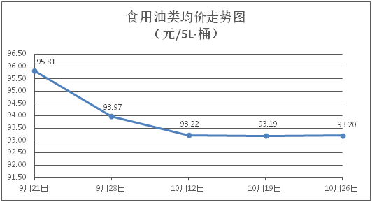 食用油類商品價格基本平穩。所監測的9種食用油(5L裝)商品價格波動情況為1漲8平,綜合零售均價為每桶93.20元,環比上漲0.01%。其中:金龍魚花生油、金龍魚調和油零售均價分別為每桶100.65元、70.57元,環比分別持平、上漲0.16%。
