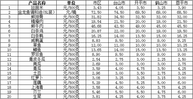 說明:1、表中價(jià)格為該地區(qū)監(jiān)測點(diǎn)綜合平均價(jià);2、“市區(qū)”含蓬江區(qū)、江海區(qū)、新會(huì)區(qū),價(jià)格分別采自蓬江市場、江南市場、城東市場等13家農(nóng)貿(mào)市場;3、其他四個(gè)縣市價(jià)格分別采自新華市場、錦江市場等8家農(nóng)貿(mào)市場。