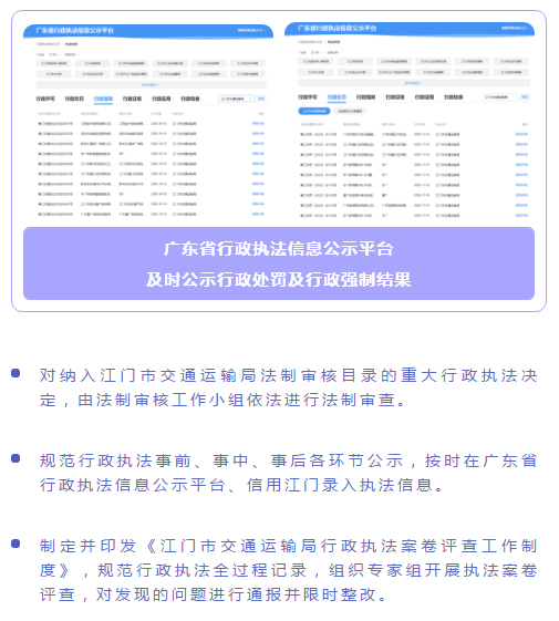 制定《江門市交通運輸局行政執法公示工作制度》《江門市交通運輸局行政執法全過程記錄工作制度》及《江門市交通運輸局重大行政執法決定法制審核工作制度》,嚴格規范文明執法。