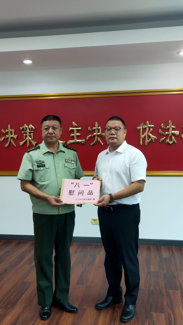 7月27日下午,在“八一”建軍節(jié)來臨之際,市交通運(yùn)輸局黨組成員、副局長黃振中帶隊(duì)到江門武警支隊(duì)開展“八一”擁軍慰問走訪活動,向武警官兵致以節(jié)日的問候,并暢談軍地發(fā)展、共敘軍民魚水情。