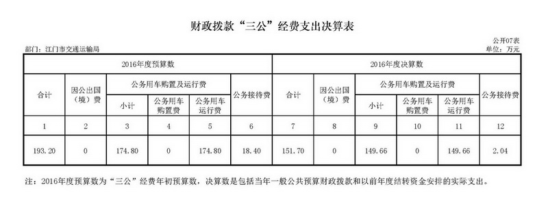 江門市交通運輸局2016年度“三公”經費財政撥款支出決算為151.70萬元,完成預算193.20萬元的78.52 %。其中:因公出國(境)費支出決算為0元,預算為0元;公務用車購置及運行維護費支出決算為149.66元,完成預算174.80萬元的85.62 %;公務接待費支出決算為2.04萬元,完成預算18.40萬元的15.81 %。2016年度“三公”經費支出決算小于預算數的主要原因:我局認真貫徹落實中央八項規定精神和厲行節約的要求,并貫徹中央和省的公務用車制度改革精神深化公務用車改革,通過嚴控“三公”經費開支,全年實際支出比預算有所節約。