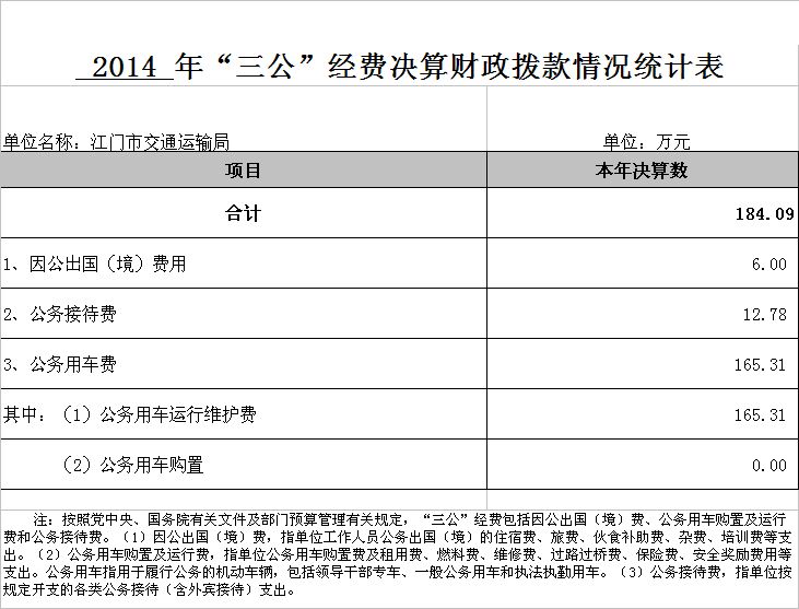 2014 年江門市江門市交通運輸局(含下屬單位)用財政撥款開支的出國(境)經費、車輛購置及運行費、公務接待費(簡稱“三公”經費)支出合計184.09萬元。