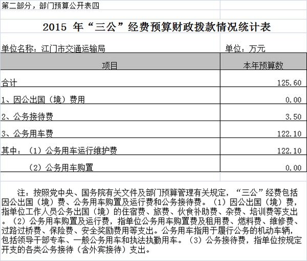 2015 年江門市交通運輸局(含下屬單位)用財政撥款數開支的出國(境)經費、車輛購置及運行費、公務接待費(簡稱“三公”經費)支出合計125.60萬元。