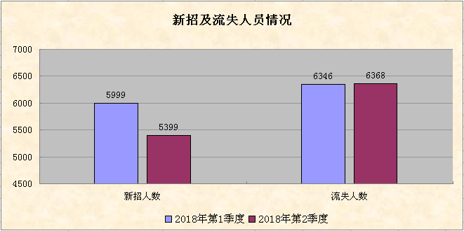 第二季度,從企業用工及人力資源服務平臺信息系統和全市人力資源服務機構的數據統計,全市用人單位登記招聘職位數共45681個,登記求職人數共34455人,總體職位供求比為1:0.75(招聘職位數為1,求職人數為 0.75,下同);全市人力資源市場總體用工缺口為11226人。
