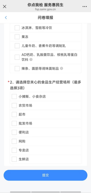 2.點擊“2025年廣東省江門市食品安全‘你點我檢 服務惠民生’活動(第3期)”的“參加”按鈕,進入“問卷填報”,選擇您關心的食品品種、食品生產經營場所,最后點擊“提交”,即可完成投票。