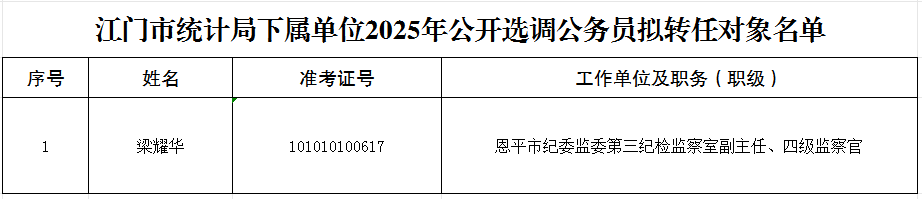 附件:江門市統計局下屬單位2025年公開選調公務員擬轉任對象名單