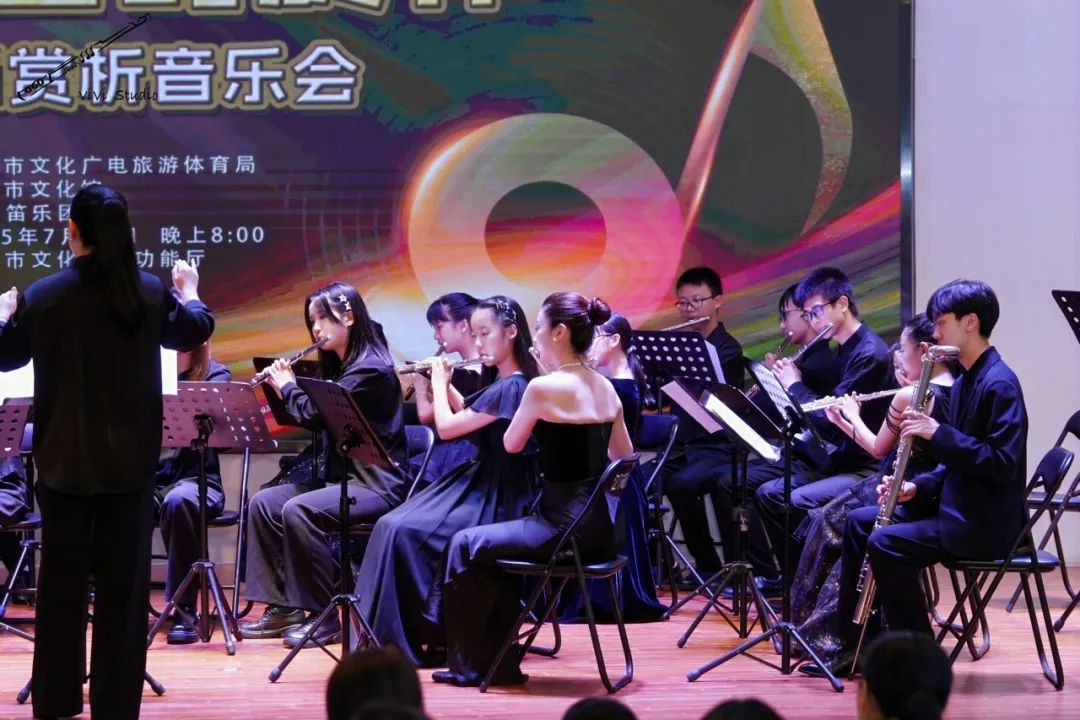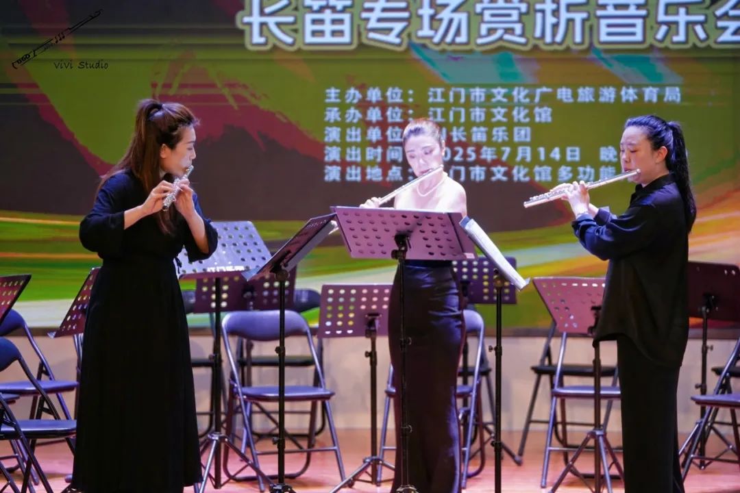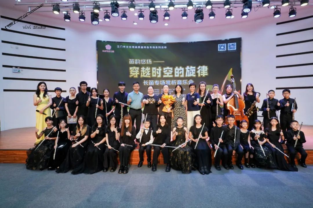 當《茉莉花》的東方清韻與《第二圓舞曲》的西方優雅在長笛的呼吸間完美交融,當《超級瑪麗》的跳躍節奏邂逅《我和我的祖國》的深沉情懷,會碰撞出怎樣絢麗的藝術火花?7月14日晚,江門市文化館多功能廳內,時光在笛聲中流轉,藝術在共鳴中升華,由江門市文化廣電旅游體育局主辦、江門市文化館承辦、Vi長笛樂團演出的“笛韻悠揚:穿越時空的旋律”長笛專場賞析音樂會圓滿落幕,為僑都樂迷奉上了一場融聽覺盛宴與心靈啟迪于一體的“三點三精彩之旅”。