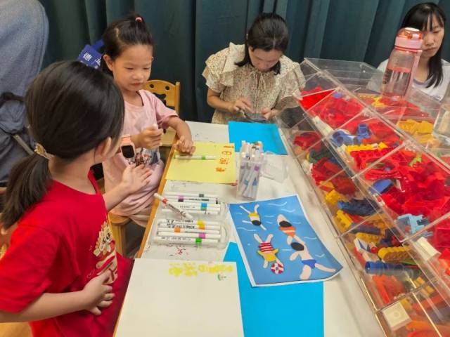 孩子們拿起彩筆、粘土、剪刀和卡紙,在家長的陪伴下,盡情發揮想象力,描繪心中夏日游泳的畫面。有的孩子畫了和Maisy一樣在泳池里嬉戲的場景,有的用粘土捏出了可愛的游泳圈和小鴨子,還有的剪出了五彩斑斕的浪花……每一幅作品都充滿了童真與創意。家長們在一旁耐心協助,時不時給予鼓勵和贊美,看著孩子們專注的神情和完成作品后的開心笑容,現場洋溢著滿滿的幸福與溫馨。