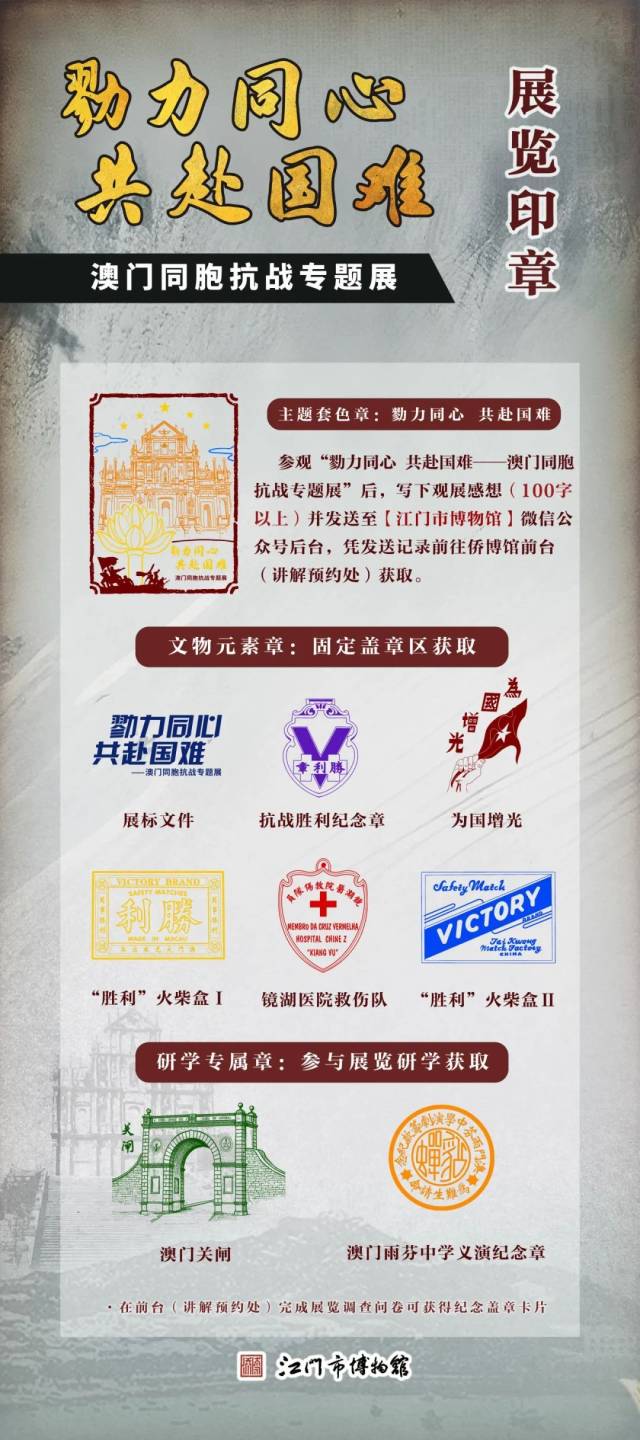 本次展覽共推出9款展覽主題印章,其中展標印章1款、主題套色章1款、展品元素印章5款,研學專屬章2款。主題套色印章可通過本次展覽留言活動獲取,研學專屬章可關注后續(xù)公眾號所發(fā)布的研學招募活動,其余可在展覽固定蓋章區(qū)獲取。同時還推出展覽專屬蓋章卡片,可于僑博館前臺完成本展覽調查問卷獲取。