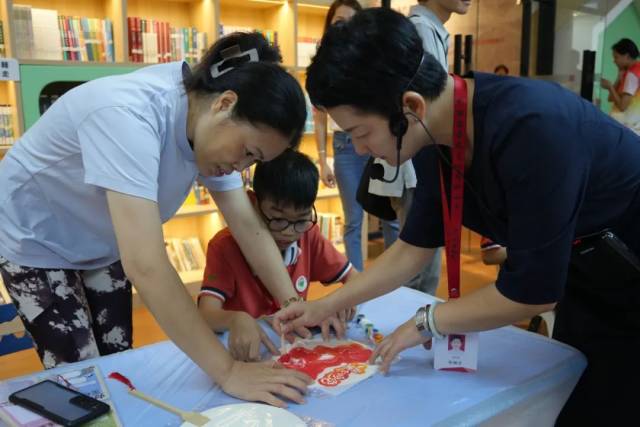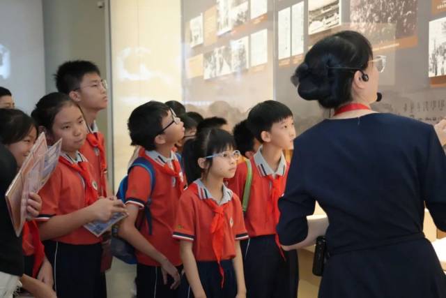 與展覽同時推出的,還有展覽配套的研學活動、蓋章打卡活動。美景小學師生代表作為展覽的首批觀眾、研學活動首批體驗官在新展展廳全神貫注地傾聽資深講解員對展覽內容的解讀,挖掘展出文物背后蘊含的時代內涵。在講解結束后,學生們還參與了愛國主題團扇拓印活動,通過手工活動再一次回味展覽內容。