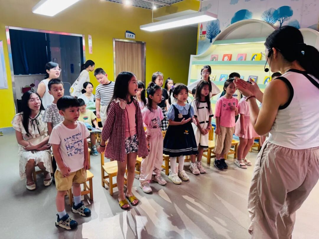 活動伊始,一段歡快的親子互動英文歌《Our School》視頻瞬間點燃了現場氣氛。屏幕上,活潑的動畫角色伴隨著動感的節奏歌唱起舞,描繪著校園里的歡樂場景。志愿者老師帶動孩子,大手牽著小手,跟著視頻中的旋律輕輕搖擺,時而拍手,時而跺腳,稚嫩的歌聲與家長溫柔的和聲交織在一起,成為現場最動聽的 “親子交響曲”。