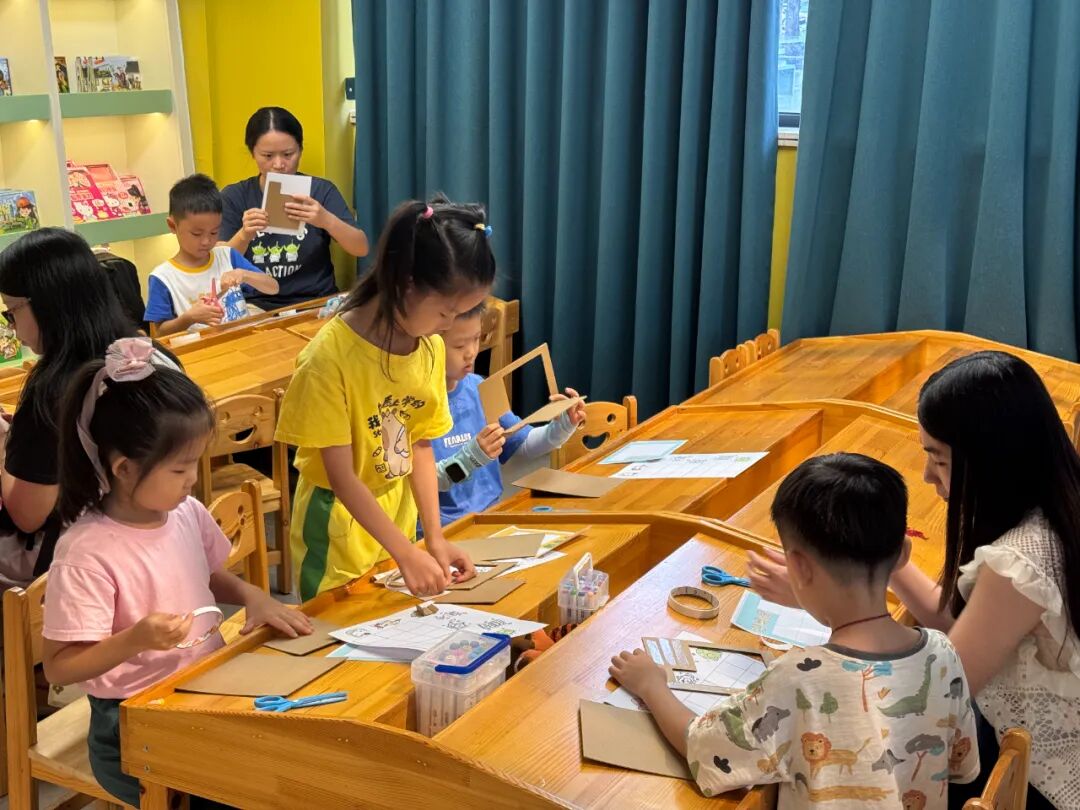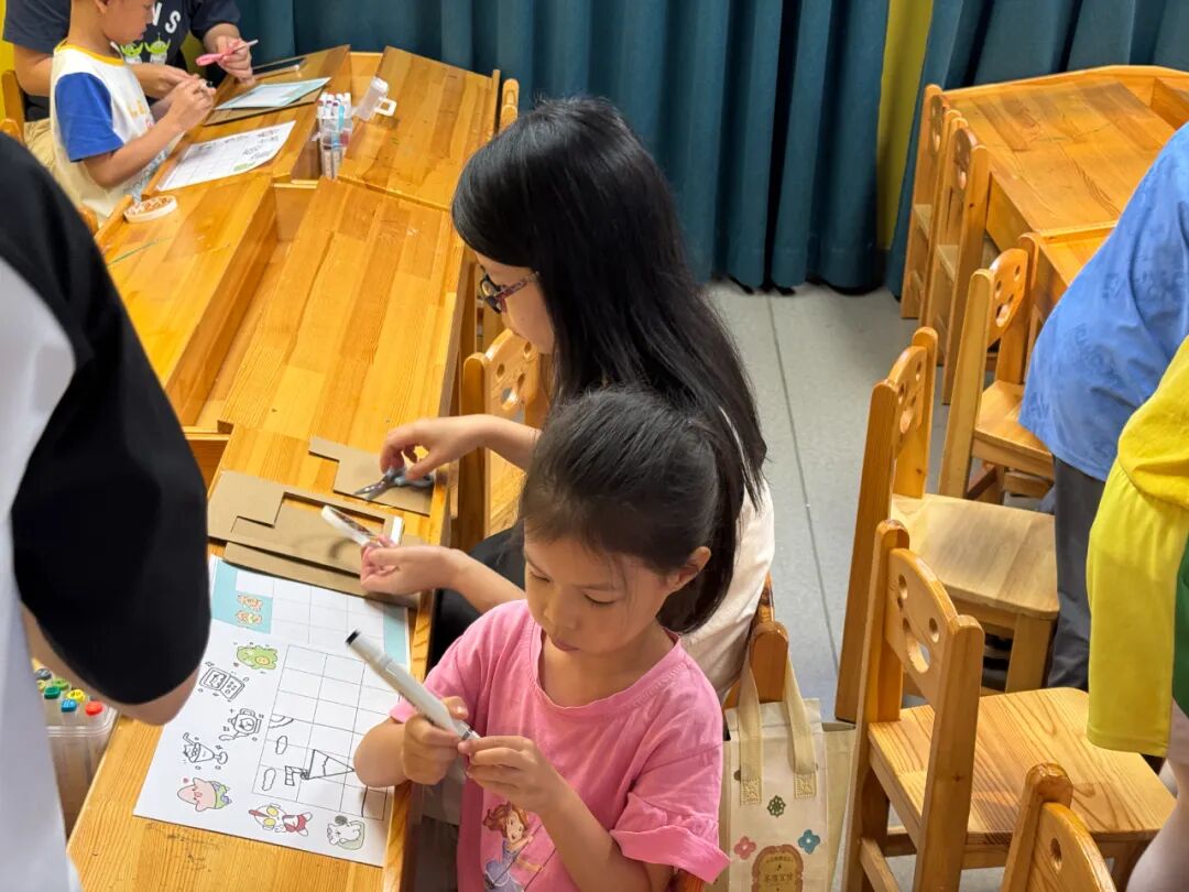 繪本講讀后,進入充滿創意的手工制作環節。文化志愿者老師為每組家庭發放了手工“華容道”材料包,并詳細講解了傳統益智游戲的歷史背景與拼裝技巧。親子家庭分工協作,有的負責涂色描框,有的專注研究拼圖布局,現場充滿了歡聲笑語。