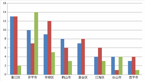 市轄區1發生事故9起(其中道路運輸事故6起、水上運輸事故2起、其他行業2事故1起);蓬江區發生事故13起(其中商貿制造業事故2起、建筑業事故3起、交通運輸和倉儲業事故7起、其他行業事故1起);江海區發生事故4起(其中建筑業事故1起、交通運輸和倉儲事故業3起);新會區發生事故7起(其中農林牧漁業事故1起、商貿制造業事故3起、建筑業事故1起、交通運輸和倉儲業事故1起、其他行業事故1起);臺山市發生事故4起(其中農林牧漁業事故1起、商貿制造業事故1起、交通運輸和倉儲業事故2起);開平市發生事故10起(其中商貿制造業事故1起、交通運輸和倉儲業事故9起);鶴山市發生事故8起(其中商貿制造業事故3起、建筑業事故1起、交通運輸和倉儲業事故4起);恩平市發生事故3起(其中商貿制造業事故1起、交通運輸和倉儲業事故2起)。