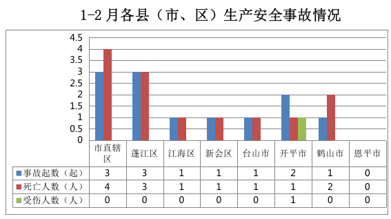 市直轄區事故3起,蓬江區事故3起,江海區事故1起,新會區事故1起,臺山市事故1起,開平市事故2起,鶴山市事故1起。恩平市無發生生產安全事故。