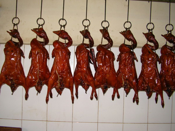 古井的燒鵝制作有其獨特之處,從選鵝到燒鵝都很講究。首先要精選三個半月鵝齡的本地壯鵝,這個時期的鵝最合適;其次是必須明火燒烤而成,炭、電爐、微波爐都無法燒烤出正宗品位的燒鵝;所用木柴也有講究,只能用徹底干的荔枝樹、龍眼樹、桂皮干枝、柑橘干樹枝條等一些耐火少煙少樹脂的木柴為燃料;入爐前所有的生鵝要在肚里填充好幾十種名貴材料如:汾酒、桂皮、茴香、陳皮等,外涂蜂蜜、麥牙等材料,并且要用氣筒充氣,用鐵桿鎖口,因充氣后燒鵝的皮與肉分離,才有皮脆肉嫩的效果。